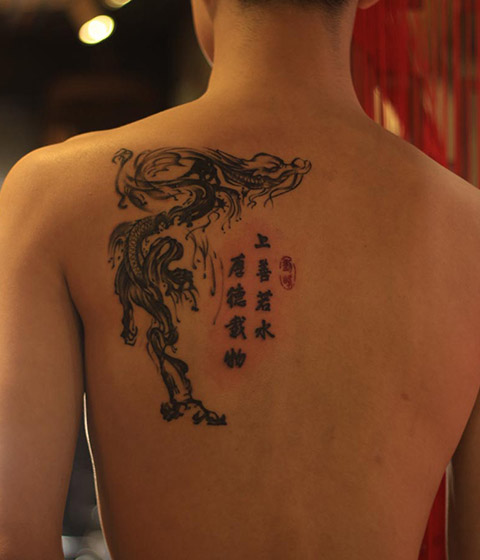 中国風水墨龙 双大臂纹身 男生大臂上黑色的飞龙纹身图片,男生大臂上黑色纹身点刺技巧龙纹身图片。